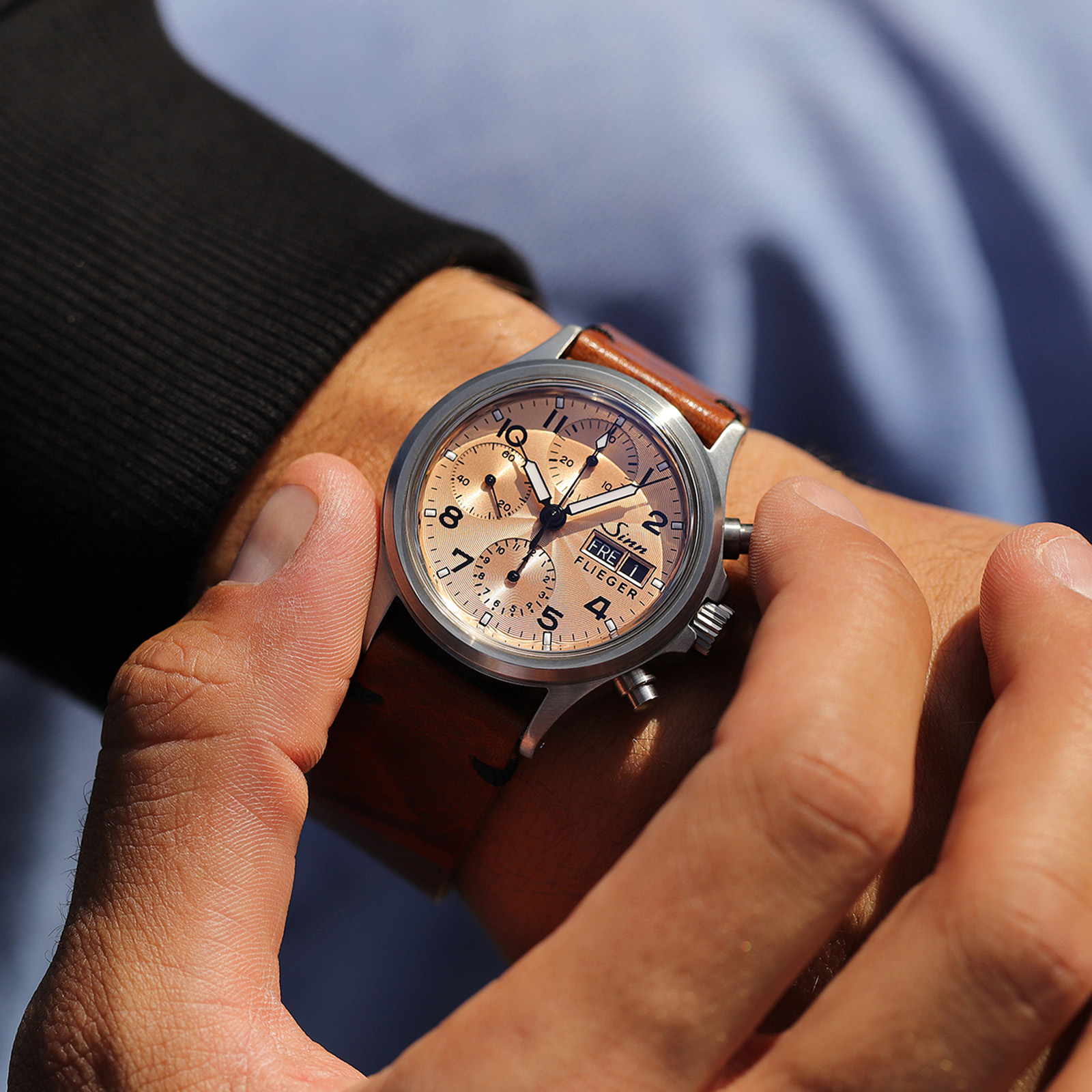 ドイツ語でパイロットを意味するFLIEGER/フリーガーというシリーズ名に象徴されるように、古典的な直径38.5mmのケースにサテン仕上げを施し、洗練された抜群の視認性と機能性が魅力です。356.SA.FLIEGERに登場したこのモデルは、ギョーシェ彫りを施したコッパー(銅)色仕上げの文字盤が特徴です。ギョーシェとは文字盤に施される細かい彫り模様の事で、光の反射を防止する役目もあります。さらに、5種類の異なる曲率半径を持つドーム型に加工された、曲面サファイアクリスタルが特徴です。特別工具を使用し複雑な工程を経て厚さ5mmのソリッドガラスを慎重に研磨しており、この効果は古典的な外観を高めるだけでなく、従来のフラットなガラスに比べ耐久性が高く、弾力性に富んだものになります。両面無反射コーティングを施すことで、極端な照明条件の下でも文字盤を正確に読み取ることができます。