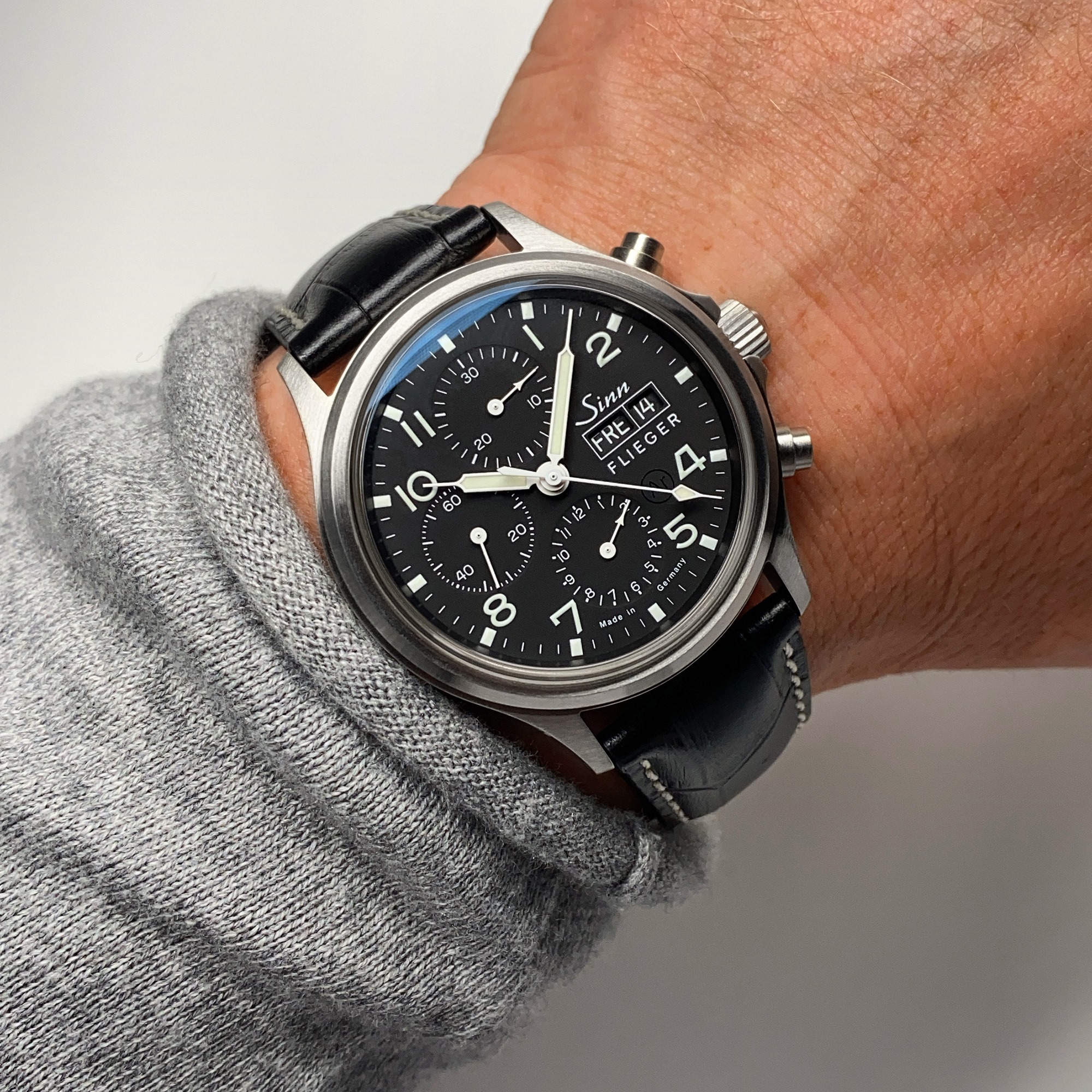 直径38.5mmの356シリーズから直径42mmへと大型化されたこのモデルは、上質感のあるサテン仕上げのケースとブレスレットに、視認性の高いマット仕上げのブラック文字盤を装備しています。風防の両面無反射サファイアクリスタルは、5種類の曲率半径を持つドーム型で、特別に開発されたツールを用い、高い技術を持つ職人により加工されています。裏蓋はフラットな内面無反射サファイアクリスタルです。クラシックな形状の蛍光針に信頼性の高いムーブメントを搭載し、上空12,000mまでの負圧耐性も備えています。さらにジン独自の除湿機構であるArドライテクノロジーも搭載しています。際立った視認性、機能性のみならず、エレガンスをも兼ね備えた、オンにもオフにも最適なプロフェッショナル・パイロットクロノグラフです。