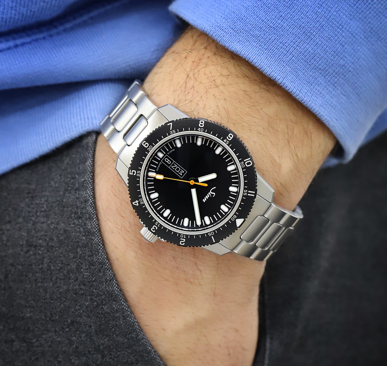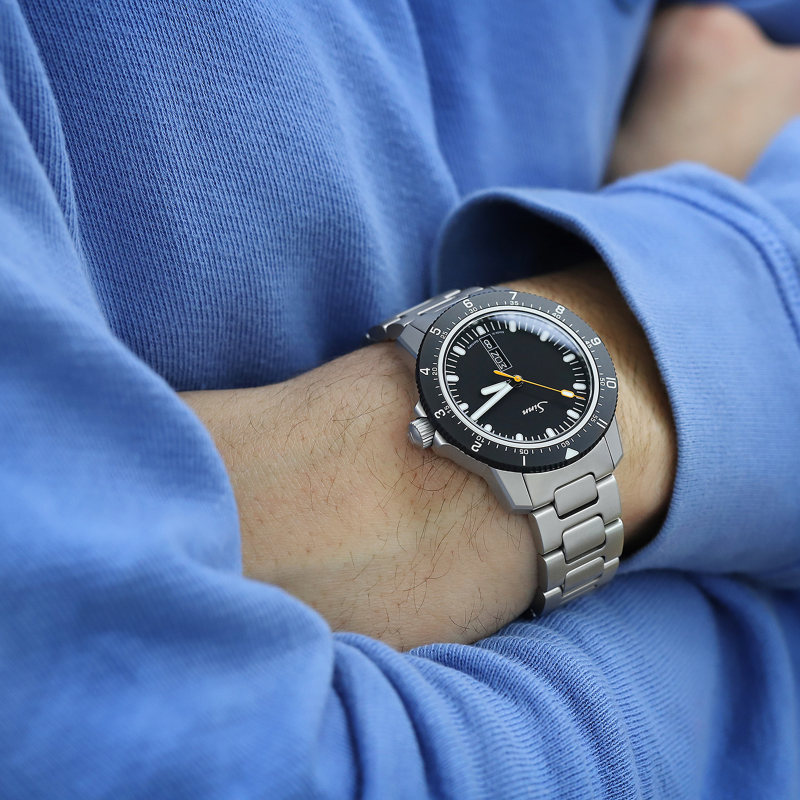 このモデルは、コンパクトで現代的な外観に多機能ベゼルを備えた、多目的に使用できる計測機器です。回転ベゼル上の分目盛を使えば時間計測が可能で、両方向に回転するベゼルの12時間目盛を使って第二時間帯を設定することも可能です。回転ベゼルにはブラック・ハード・コーティングが施され、サンドマット加工のケースに特殊結合方式で固定されているため、絶対に外れることがありません。