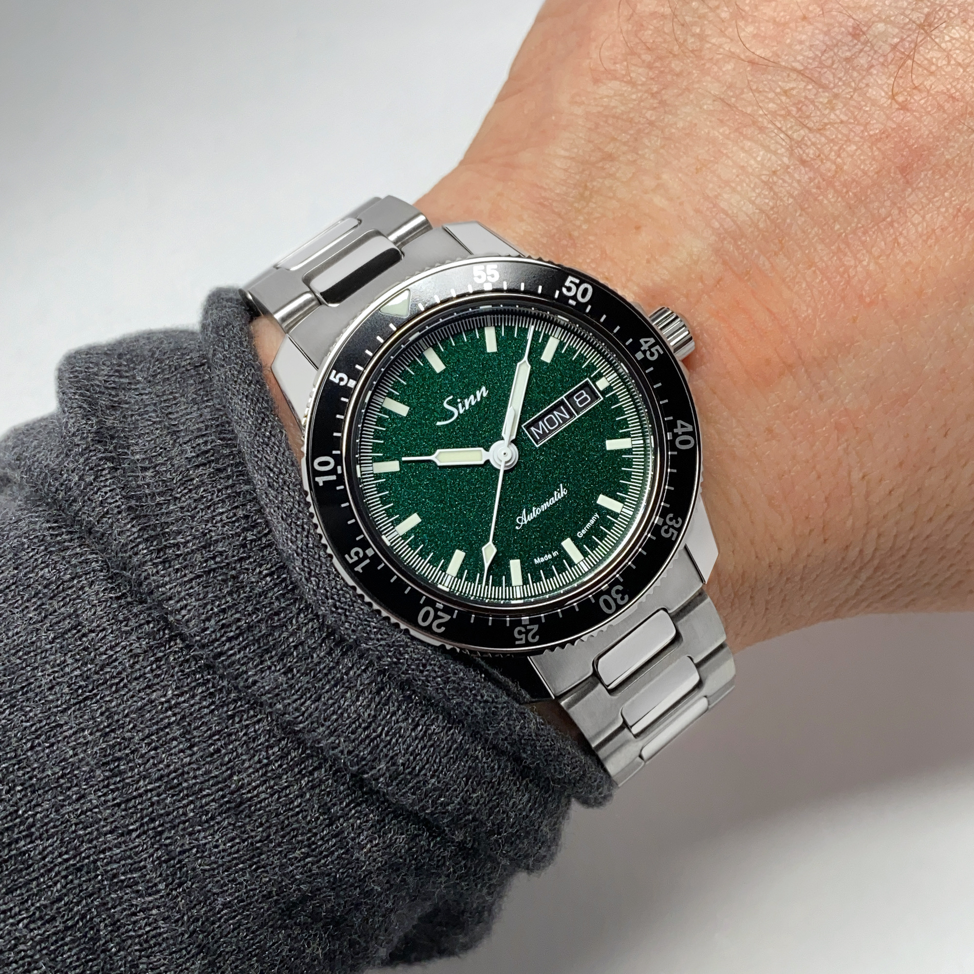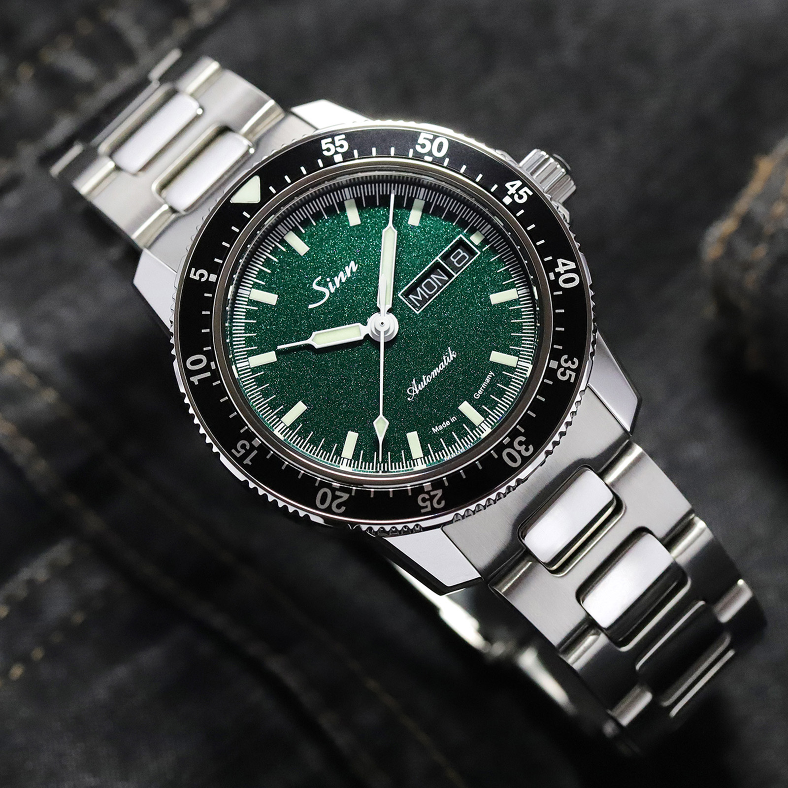 光の加減によって色合いが変わるメタリックグリーンダイヤルとバーインデックスが特徴の104.ST.SA.IGは、伝統的なジンスタイルでデザインされたパイロットウォッチです。時刻、日付や曜日、秒の視認性を高めるために明確な構造で設計されています。