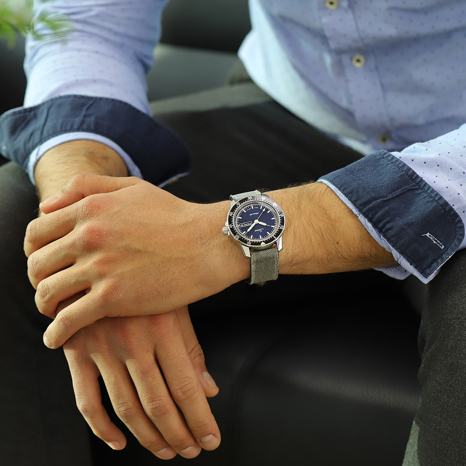ジン社創設当初の時計作りの精神を踏襲した3針のパイロットウォッチで、長針・短針・秒針のデザインや、刻時表示とデイデイト表示は最適な視認性を確保した設計となっています。文字盤はサンレイ仕上げ(太陽光線=Sunlayを由来とする放射仕上げの文字盤。サンバースト仕上げとも呼ばれる)が施されたダークブルーで、光によってその青みを変化させ、ニュアンスのある光をたたえます。ラチェット式により1分単位で設定できるパイロットベゼルは両方向回転式で、通常のスナップ式とは異なるジン社独自の特殊結合方式で取り付けられているため、不意の衝撃でも外れることはありません。時計ケースはポリッシュ仕上げが施され、サファイアガラスの風防と裏蓋もサファイアガラスで、ムーブメントの繊細で複雑な動きを見ることができます。20気圧防水と負圧耐性も備えたモデルです。