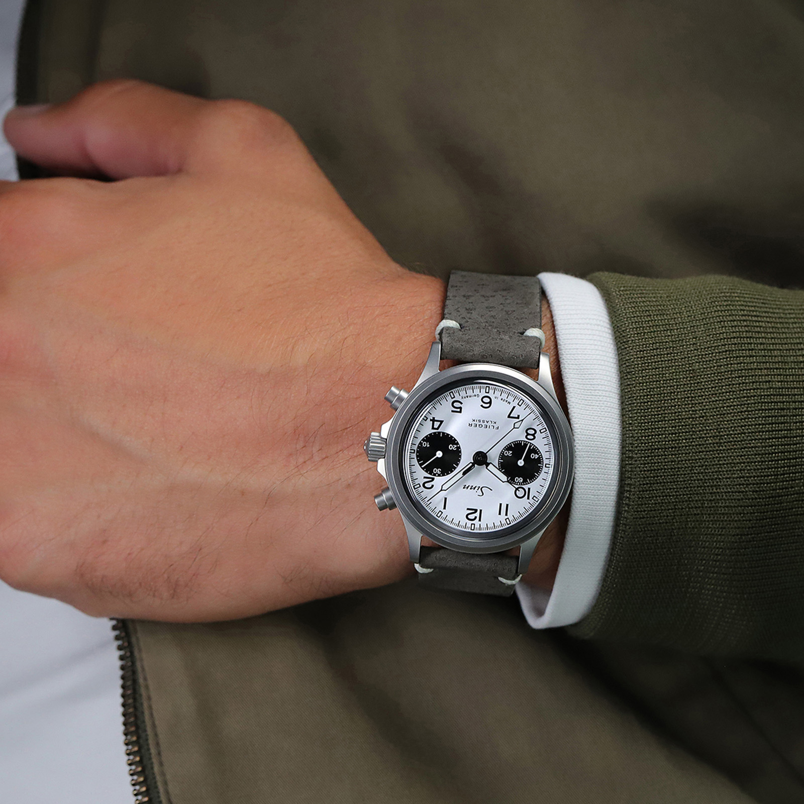356フリーガー・クラシックWは、ホワイト文字盤にブラックの電気メッキを施したマットシルクの2つ目カウンターを搭載しています。