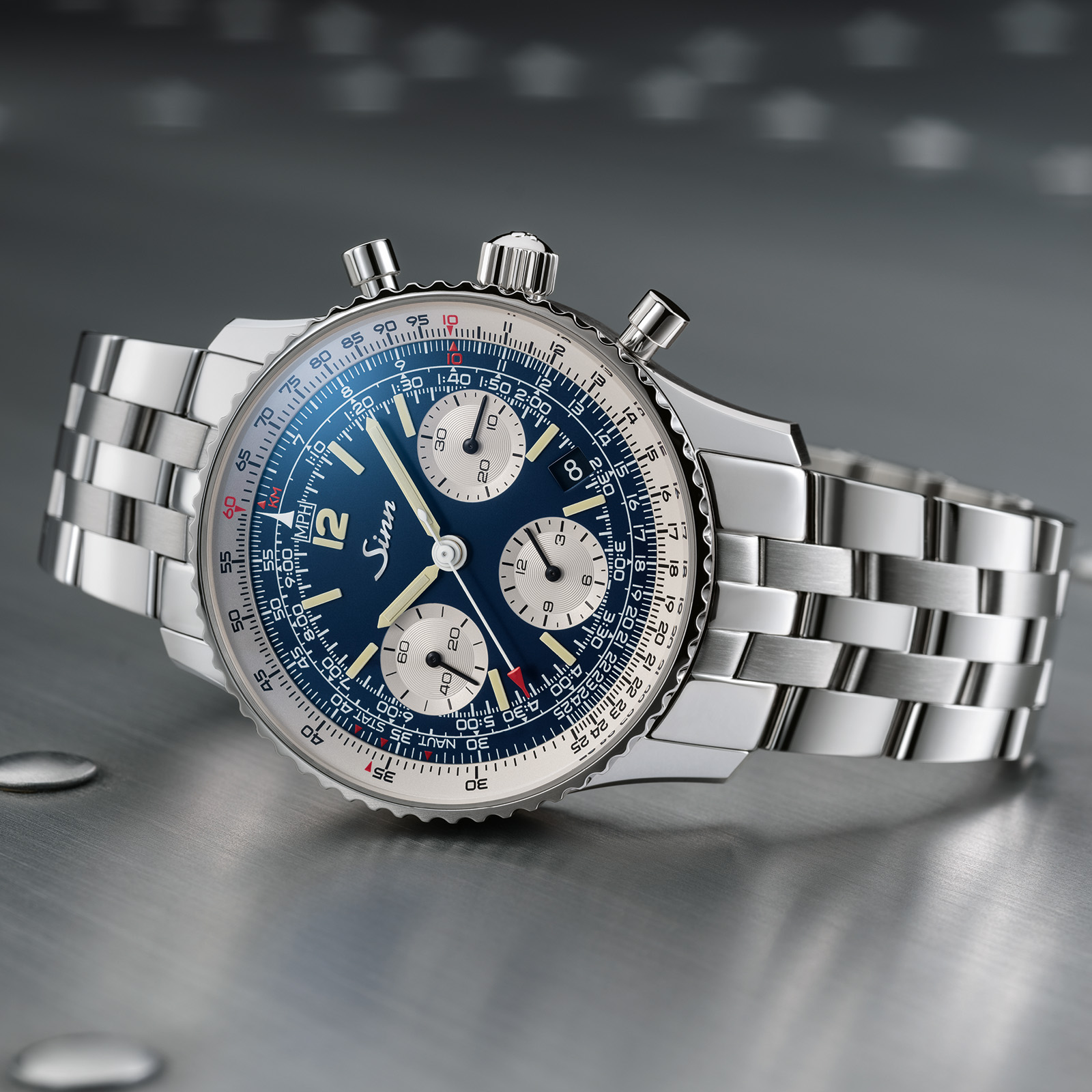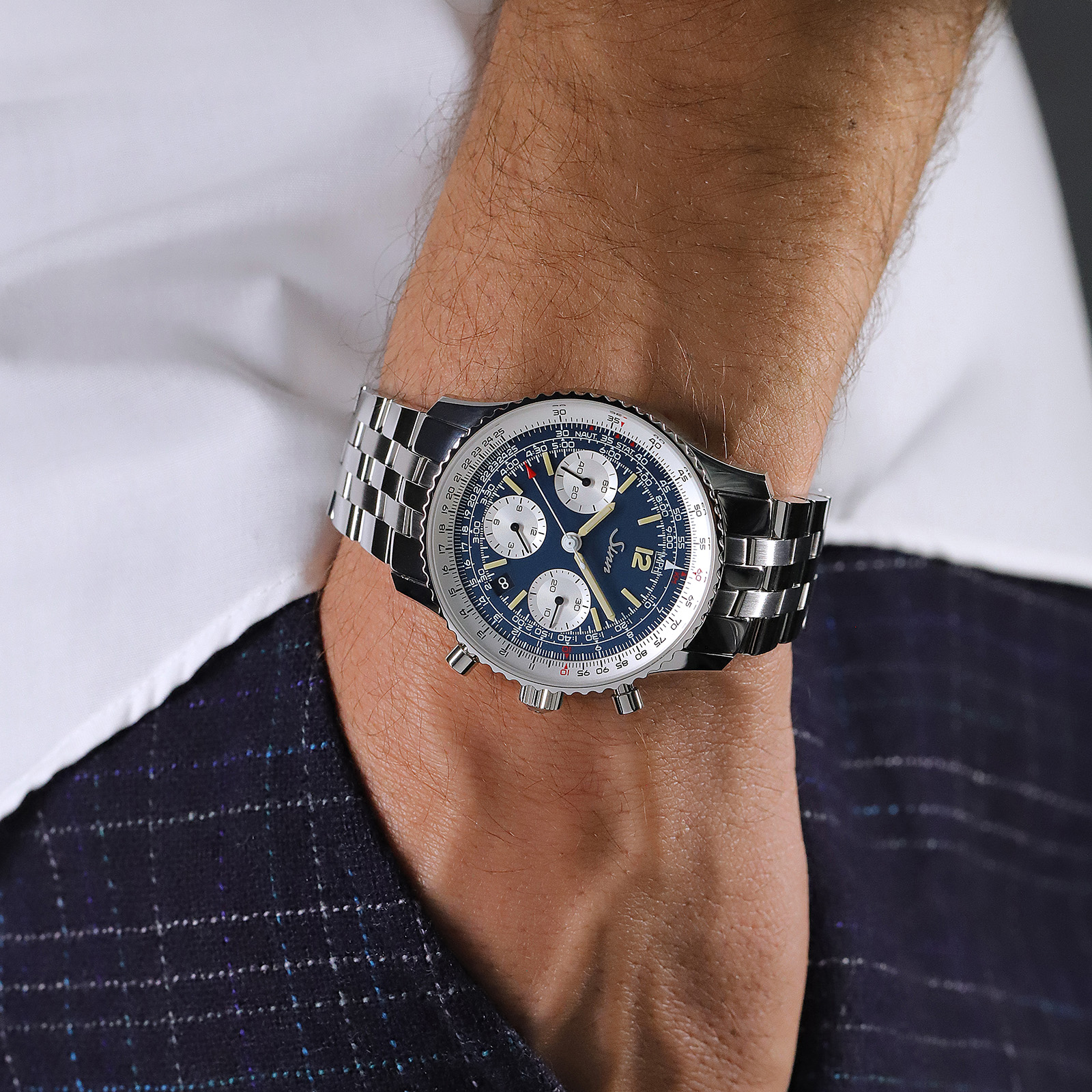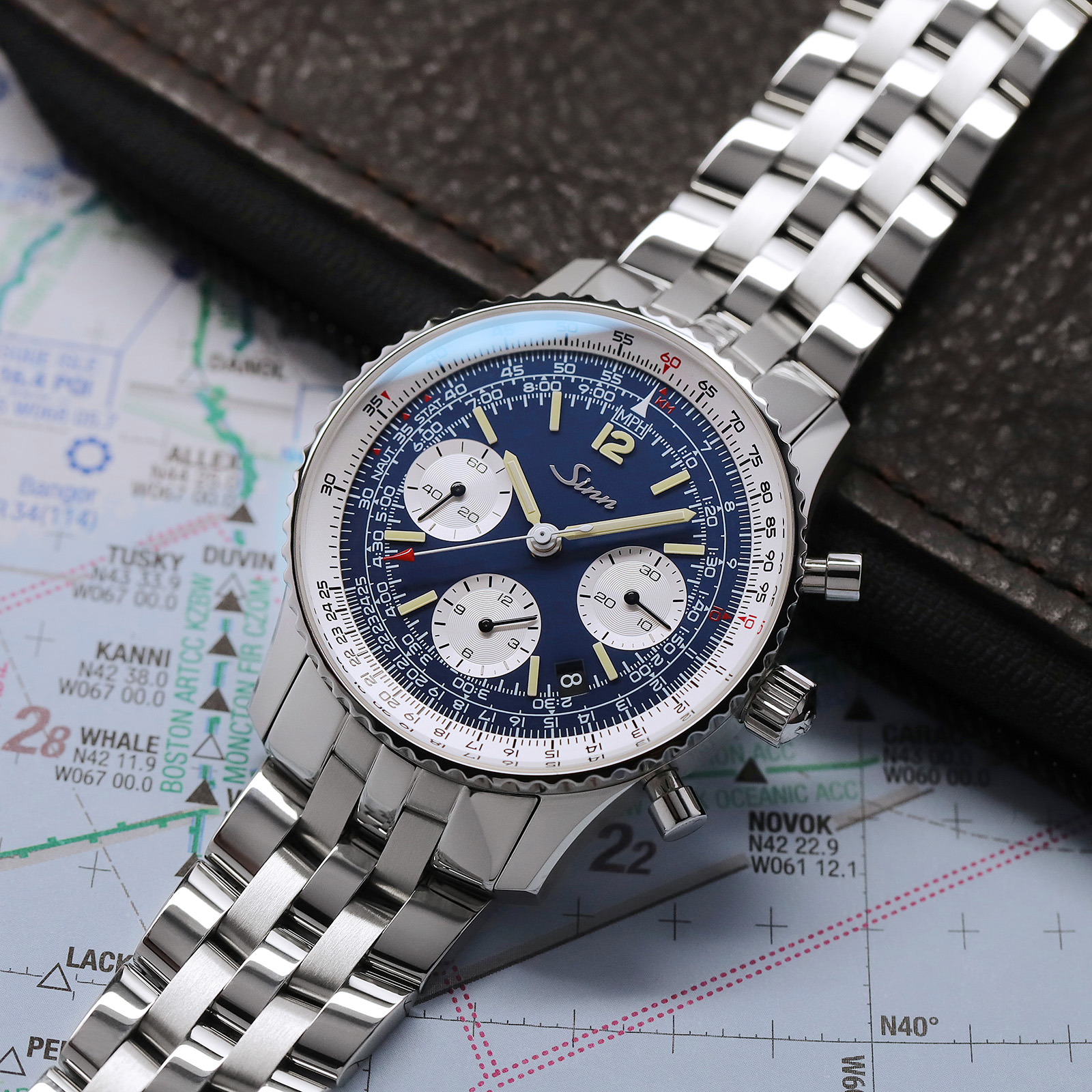 ジンではこのナビゲーション・クロノグラフの数十年にわたる歴史と伝統を刻み込んでおり、対数目盛りを備えた計算尺ベゼルは、時間、距離、燃料消費量の計算に使用できます。特筆すべきは、手作業で丁寧に取り付けたインデックスや、12の数字、時分針にハイブリッド・セラミックの夜光素材を使用していることです。高濃度の夜光塗料をそれぞれのハイブリッド・セラミックにする革新的な方法により、極めて高い輝度と暗闇での完璧な視認性を実現しています。